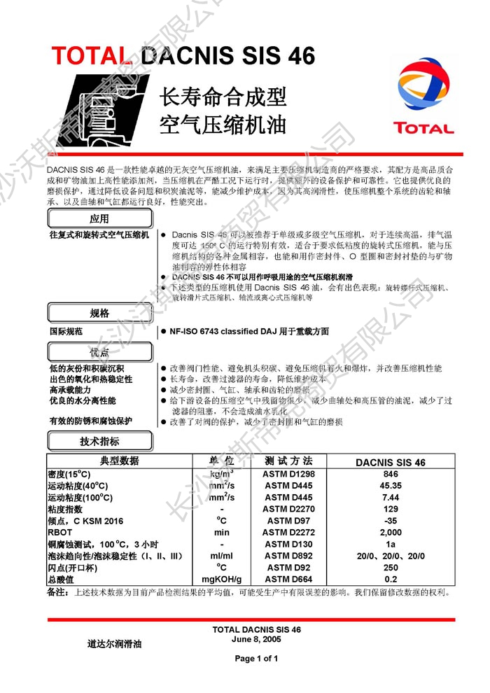 道達爾Dacnis SIS46合成空壓機油  詳細說明
