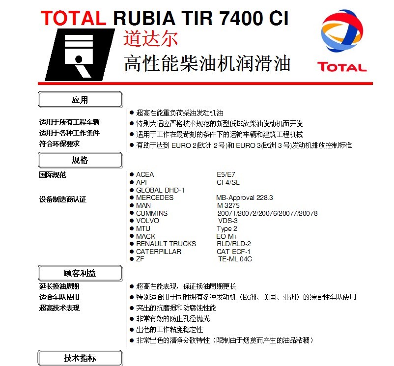 道達(dá)爾紅運TIR 7400工業(yè)發(fā)動機(jī)油  詳細(xì)說明