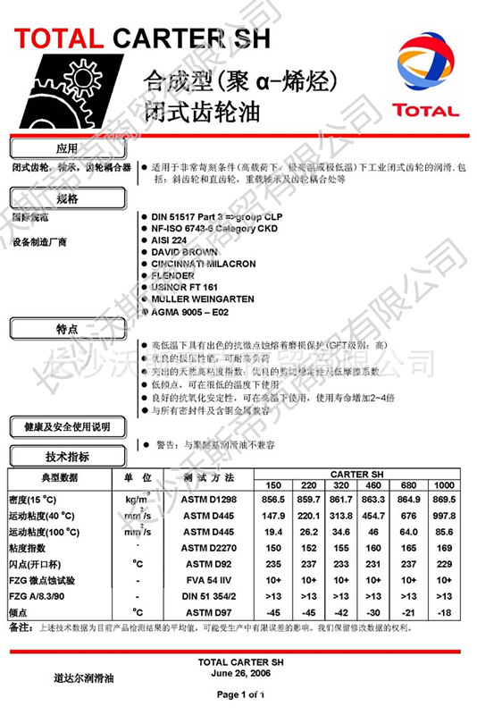 道達(dá)爾Carter SH合成型(聚a-烯烴)閉式齒輪油 詳細(xì)說明