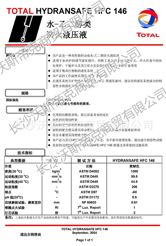 道達(dá)爾水—乙醇類HFC146抗燃液壓油 詳細(xì)說(shuō)明