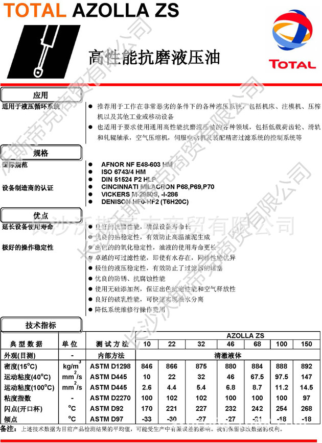 道達爾Azolla ZS高性能抗磨液壓油 詳細說明