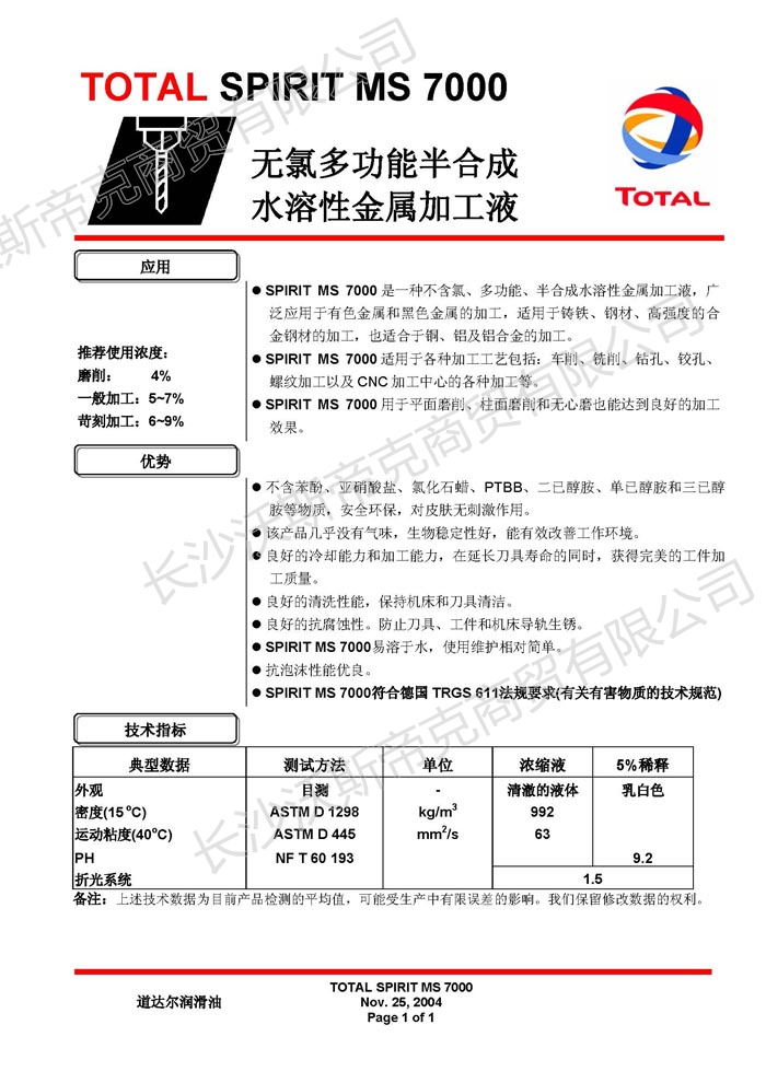 道達(dá)爾Spirit MS7000金屬加工液  詳細(xì)說明