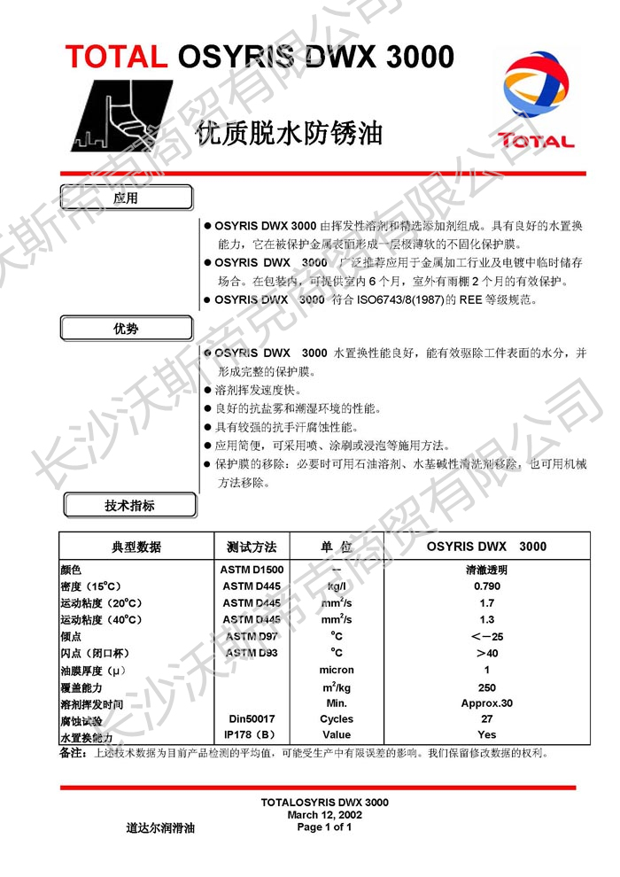 道達(dá)爾Osyris DWX3000脫水防銹油  詳細(xì)說明