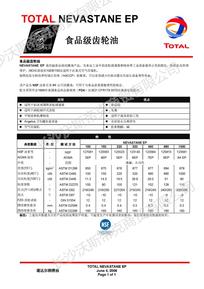 道達(dá)爾Nevastane EP食品級(jí)齒輪油  詳細(xì)說明